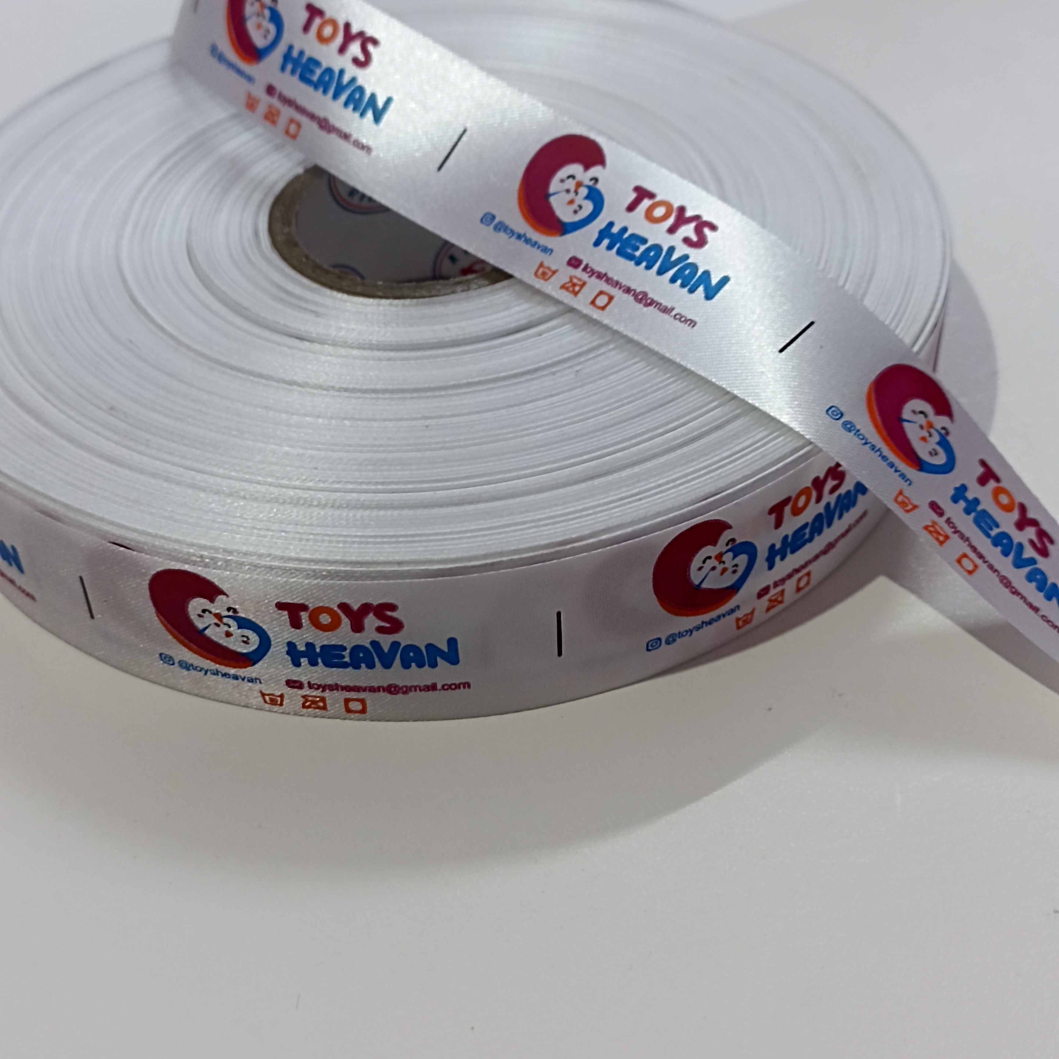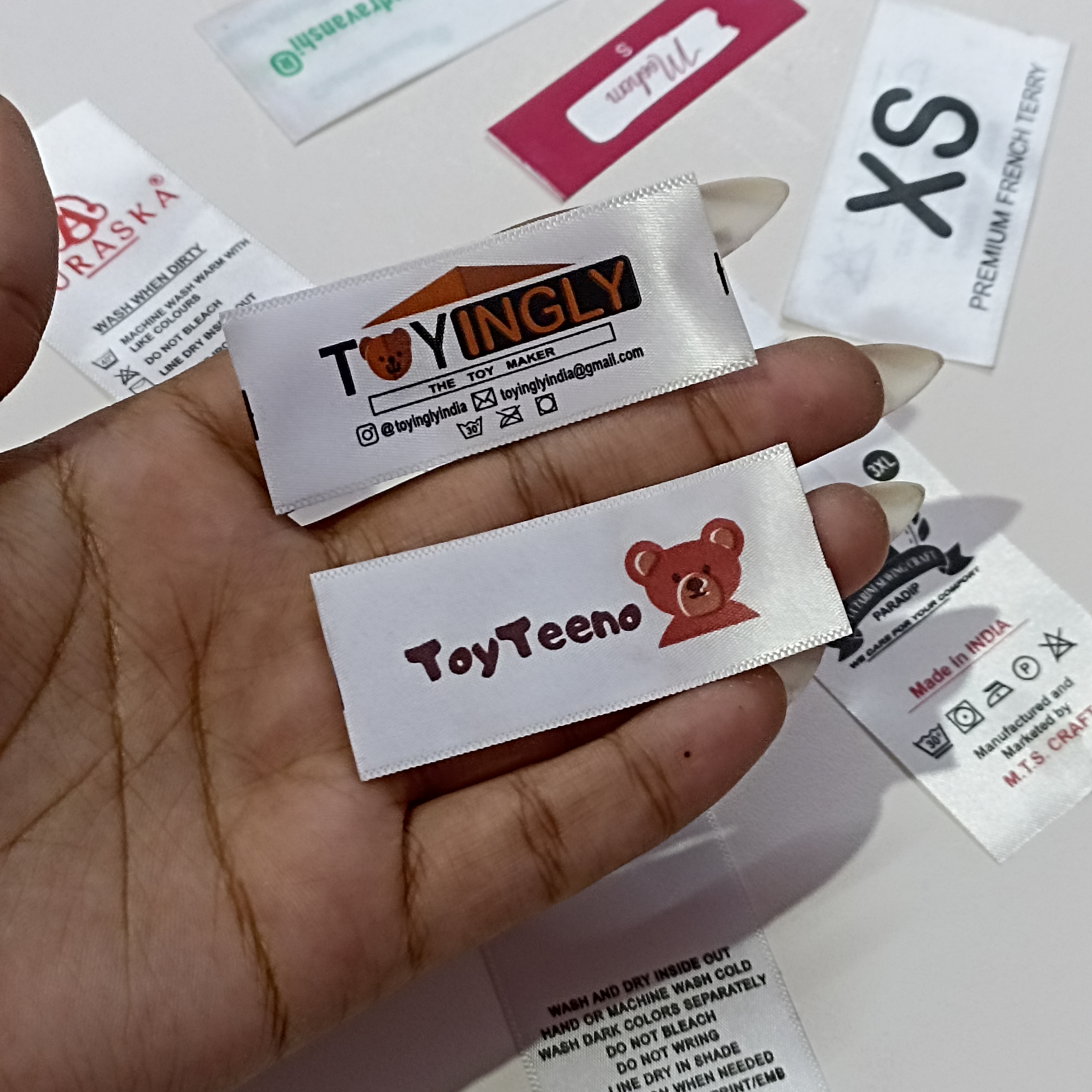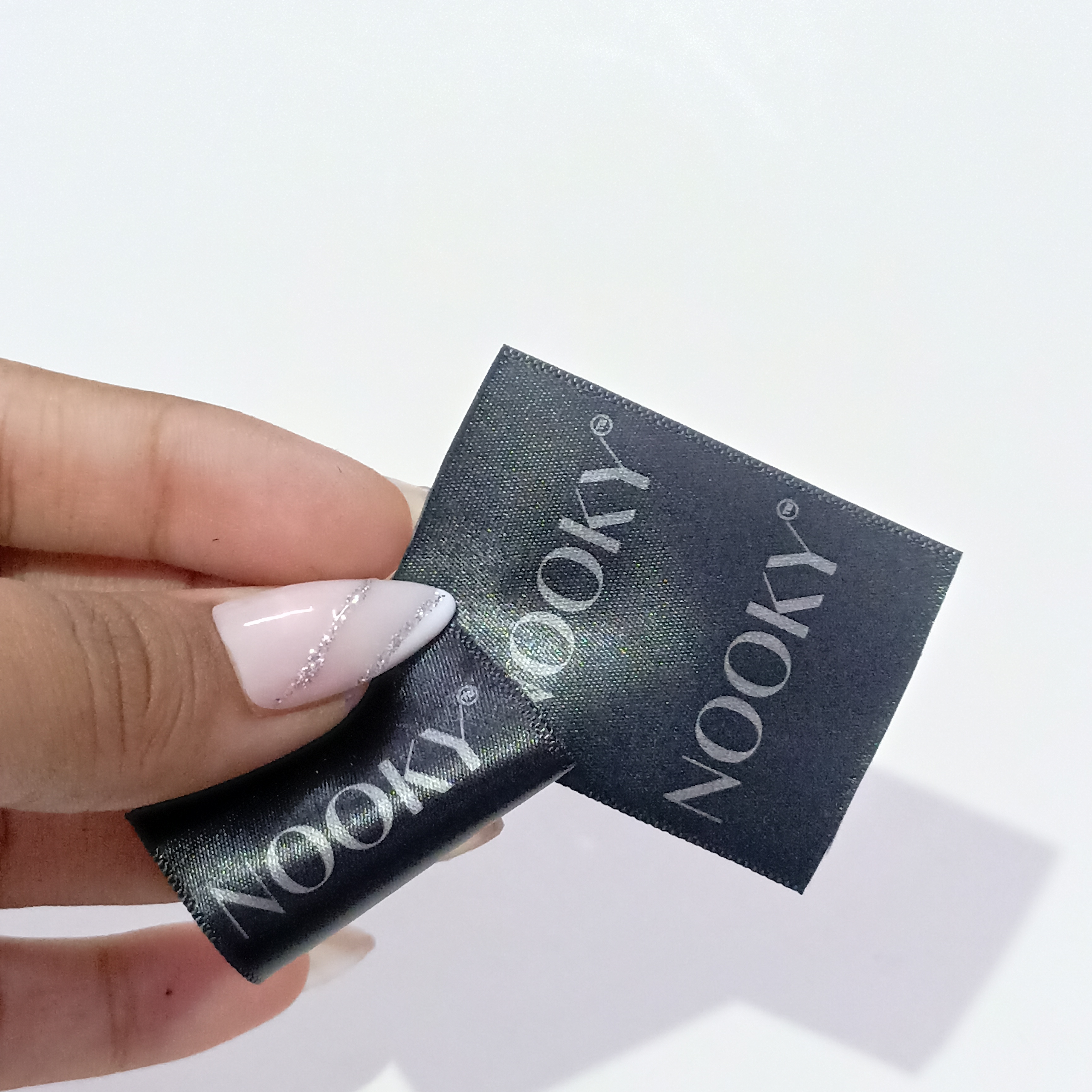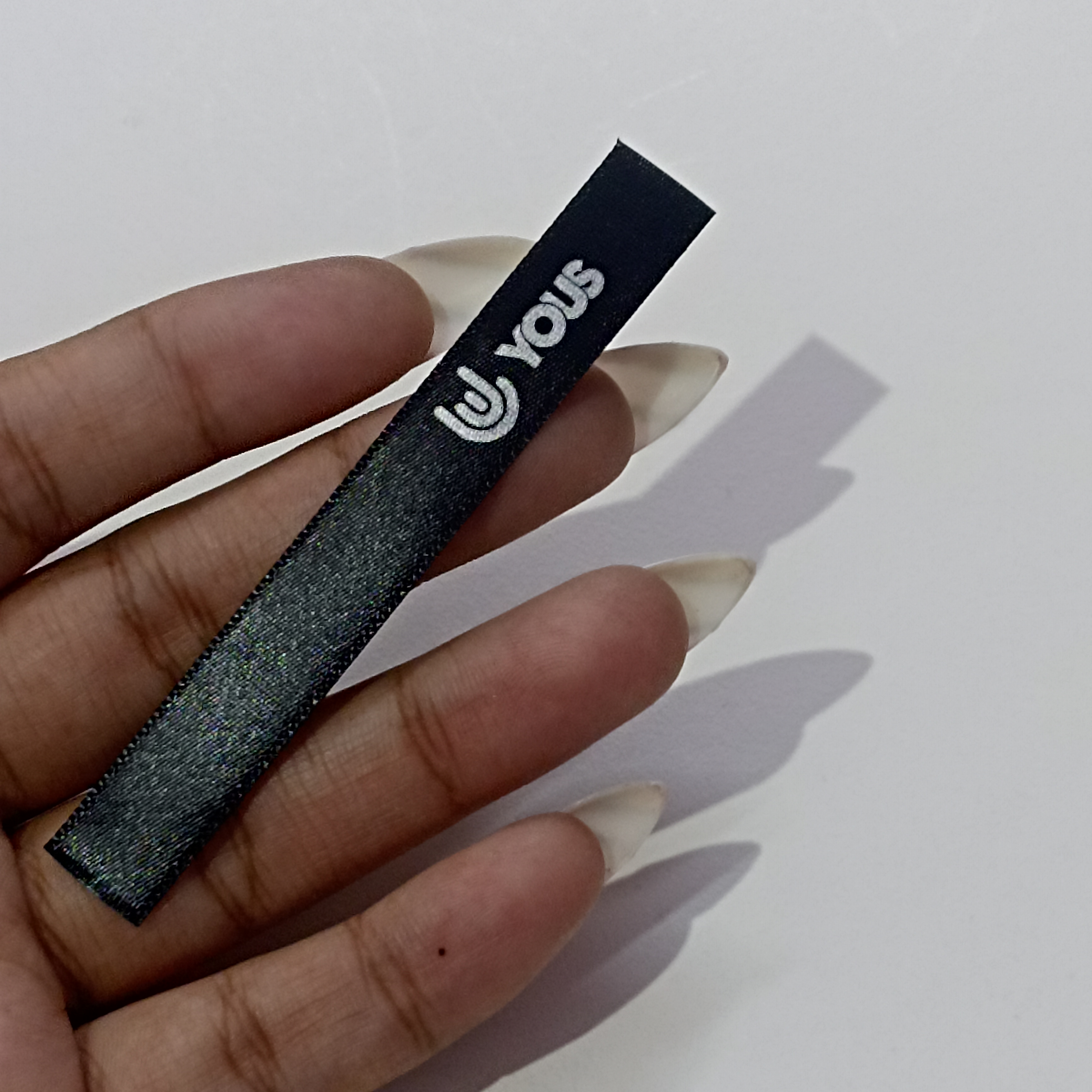 A satin printed label is a soft, glossy label made from satin ribbon or satin-like polyester fabric, where the text, logo, or design is printed (not woven) onto the surface — usually using thermal transfer, screen printing, or digital printing.